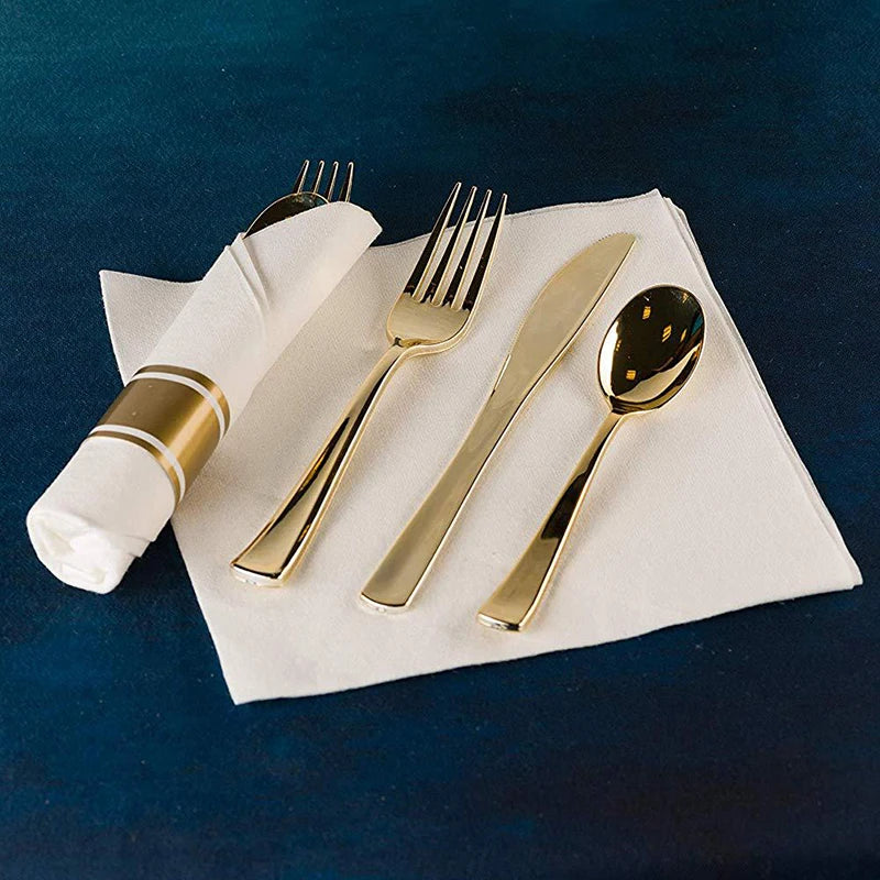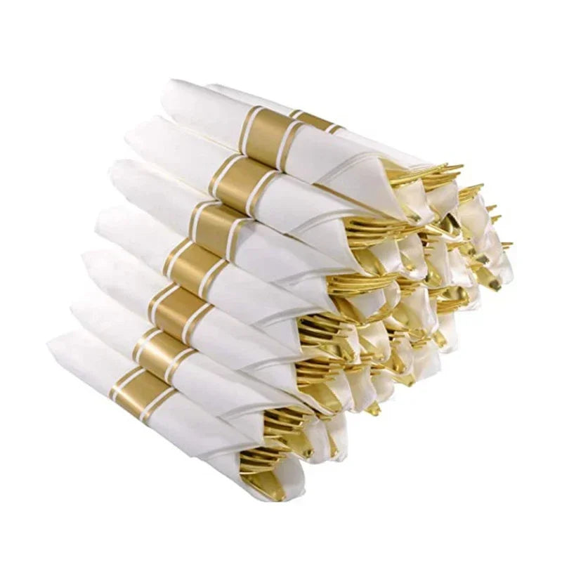 25 st engångsbestickset med servett – förbruksartiklar för bröllop, pappershandduk, för-rullat plastbestickset, guldbestick, födelsedagsfestdekoration